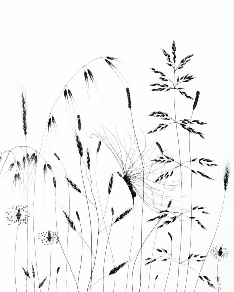 C’est autour d’un akène central que ses dessins s’articulent. Il se dresse comme le protagoniste de chacune de ses œuvres, incarnant l’indissociation de l’être humain et la nature. En l’accompagnant d’autres espèces mises au second plan, Mathilde Garnier veille à constituer des ensembles saisonniers de graines. Dans ses compositions, elle joue avec les symboliques dont seront porteuses celles-ci après croissance, comme le langage floral véhiculé par les akènes destinés à devenir fleurs.
