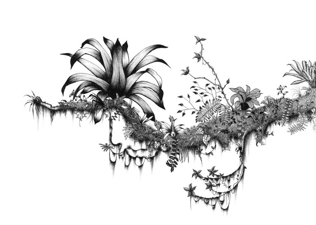 Parmi ses œuvres qui s’inscrivent dans cette thématique, nombre d’entre-elles présentent des écosystèmes endémiques des régions aux climats tropicaux. Le parcours de Mathilde Garnier à travers les Amériques et leur flore a marqué les souvenirs de l’artiste, des souvenirs qui n’ont cessé de la suivre depuis. Accompagnée de ces pensées, elle commence à élaborer ses œuvres pour s’évader et se jouer des restrictions du confinement, c’est en dessinant qu’elle se balade dans la végétation.